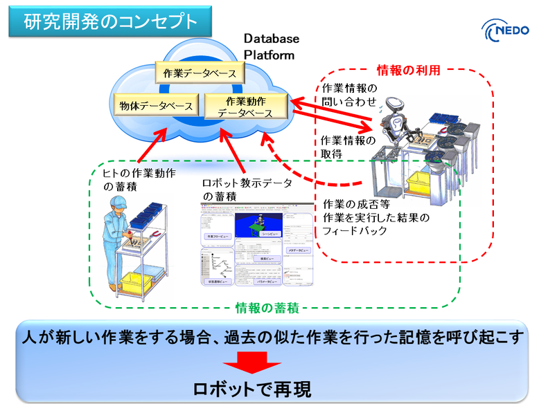 ヒトが行ってきた作業をロボットによって代替することを考え、特に部品供給作業と製品組立作業を題材として挙げている。ヒトのメカニズムに習い、ヒトの作業動作や教示ツールで得られた作業動作をデータベースに蓄積させ、ロボットが必要に応じてダウンロードする枠組みを考えた。ここでは、このフレームワークに含まれる、いくつかの主要なツールを公開。