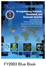2002年8月に公開されたFY2003 Blue Book:”Strengthening National, Homeland, and Economic Security”は、同時多発テロ以降の米国の立場を色濃く反映したものになっている。ここでは、政府支援によるIT研究開発の最重要目的は「米国の国家、国土および経済の安全保障の強化」のためであり、巻頭の10ページにわたって、NITRD計画により開発された先進技術が国家、国民および経済の安全の確保にいかに貢献しているかが強調されている。