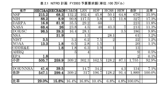 FY2003 Blue Bookに掲載されている、NITRD関連の省庁およびPCAごとの2003年度予算要求額を表2.1に示す。ハイエンドコンピューティング関係(HEC)予算は全体の半分近く(44.8%)を占めており、当初よりNITRD計画の中心的存在となっている。