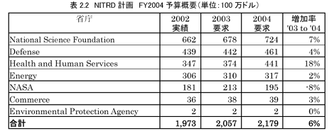 表2.2を見ると、NITRD計画の予算はFY2004予算案においても全体的には順調な伸びを示しており、あいかわらずHealth and Human Services(バイオ、医療関係)の大きな伸びが目立っている。その一方でNASA関係の予算が8%削減されているのが目に付く(ただし、NASAのFY2004予算は、2003年2月1日のスペースシャトル、コロンビア号事故の影響で大きく変わる可能性あり)。