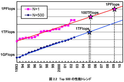 図2.2は1993年から2002年まで10年間のTop 500の1位と500位の性能推移をグラフにしたものである。過去10年間は年率1.9〜2.0倍の割合で性能が向上しており、今後もこの傾向が続くとすれば、2005年に1位が100TFlops、500位が1TFlopsに達し、さらに2009年には1位が1PFlops(ペタフロップス)に達すると予想される(あくまでもLINPACKベンチマークの性能であり、理論ピーク性能ではないことに注意)。