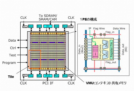 各PEは8bitのALU, シフトやデータ制御、簡単な論理演算を行なうDMU(Data Management Unit)、8bitのFlip Flop、レジスタファイルから構成される。DRPは、上記構成のCoreの周辺部に32ビットの乗算器を8セット、メモリモジュール、PCIバスインタフェース、SDRAM/CAM/SDRAMインタフェースを搭載したシステムLSIとなっており、単独でPCIバスへの接続や外部メモリの制御が可能である。