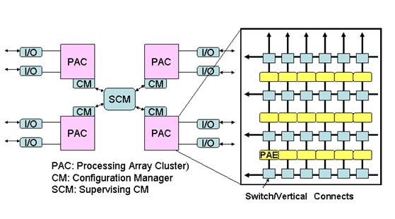 ドイツのPACT Informations technologieにより発表されたPACT XPP(eXtreme Processing Platform)は、階層的な構造を持つ再構成可能なプロセッサアレイである。図2に示すように、32bitのALU、FREG(Forward Register Object), BREG(Backward Register Object)から構成されるPAE(Processing Array Element)を2次元アレイ状に接続し、PAC(Processing Array Cluster)を構成する。このPACを複数接続することでシステムを構成する。バスの縦横の端には、I/Oが装備され、さらにConfiguration用RAMとマネージャがConfiguration busを介してConfiguration dataを流し込む。それぞれのアレイには互いに同期をとってパイプライン動作を容易に行なうことができる。