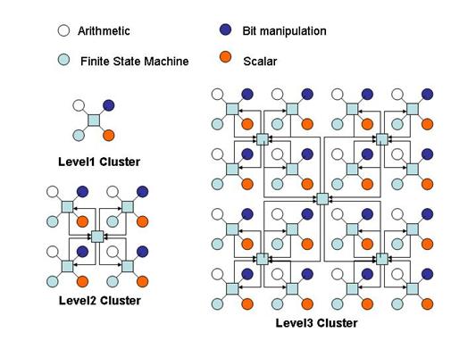Quicksilver社から2002年に発表され、FPL2002の基調講演で発表が行なわれたが、詳細な情報が公開されていないので不明な点が多い。図3に示すように、算術計算用、ビット処理用、状態マシン、スカラープロセッサの4種類のプロセッサがクラスタを構成し、これらのクラスタを4つずつまとめて、階層型ツリー構造で接続される構造を持つ。