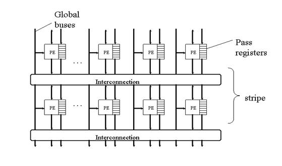 Stripe単位に1クロックで構成を変更することが可能である。2002年に完成したチップは、チップ内に実Stripeを16保持し、これを切り替えるための仮想Stripeを256セット保持することができる。c)プログラム