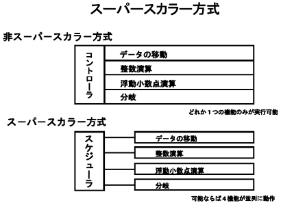 等が行われてきた。この流れを見ると、スーパースカラーまでは、プロセッサ内の演算順序の変更、並列化等はすべてハードウェアが行ってきた。しかし、VLIWからは、ハードウェアが行ってきた並列動作の制御等を、コンパイラを中心としたソフトウェアに依存する方向になってきたと考えることができる。この延長線上には、ソフトウェアコントロールのキャッシュ機構が来ると考えることもできる。ベクトル機構も、見方を変えるとソフトウェアコントロールのキャッシュと考えることができる。