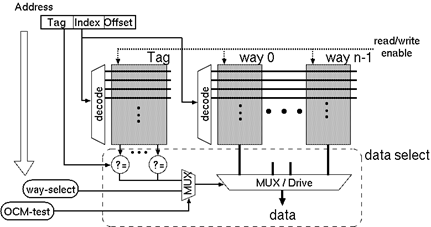 SCIMAのキャッシュ・SCM統合機構を図3に示す。従来のキャッシュの機構に対し、SCIMAではアクセスされたアドレスがSCM領域に対するものかどうかの判定(SCM-test)と、その際にどのウェイのデータをアクセスすべきかの選択(way-select)を行なう回路が追加される。本機構において、SCM-test回路でキャッシュアクセスと判定された場合は、従来のキャッシュアクセスと同様の動作となる。一方、SCMアクセスと判定された場合は、way-select回路により決定されるウェイ内のデータが選択される。この時、アクセスすべきセットは、SCM-testの判定結果によらず、アドレスのIndex部のみで決定される。従って、選択すべきデータのウェイをキャッシュアクセス時より早い段階で決定することができ、SCMアクセス時には1つのウェイのみを選択的にアクセスすることができるため、消費電力の削減につながる。さらに、選択すべきデータがタグの内容に依存しないため、タグアレイへのアクセスを抑制することによる消費電力の削減も期待される。