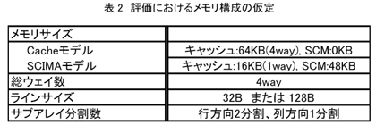 表2に評価におけるメモリ構成の仮定を示す。キャッシュ、およびSCMの構成は、合計64KB、4-wayのキャッシュを、キャッシュ・SCM統合機構により、容量比を再構成した場合を想定する。また、データアレイの各ウェイは、内部でサブアレイに分割されるが、本稿の評価ではCACIT\cite[10]により得られた最適な分割数を用いる。