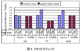 miss)と、page-load/page-storeによるトラフィック(page-load/store)の内訳も示している。この図から、すべてのプログラムにおいてSCIMAはキャッシュに比べオフチップメモリメモリトラフィックが削減されていることがわかる。これは、SCMを用いることで、必要なデータがコンフリクトなどにより追い出されることなく、再利用性を最大限に活用できた結果である。