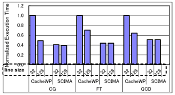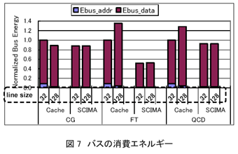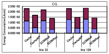 合計の消費エネルギーについて比較すると、SCIMAselではチップ内部、およびバスの消費エネルギーの両方がCacheWPに比べ削減されるため、両モデル間の消費エネルギーの差はさらに大きくなる。例えばFTでは、約50%もの消費エネルギーが、また最も低いCGの128Bラインサイズの場合でさえ5%の消費エネルギーがCacheWPに比べ削減されている。従って、SCIMAはメモリシステム全体として見た場合、キャッシュアーキテクチャに比べ低消費エネルギー化を達成できるアーキテクチャであると結論付けることができる。