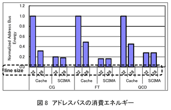 以上のことから、SCIMAではトラフィック削減により、実際にデータバス、アドレスバス共に消費エネルギーを削減することができると言える。