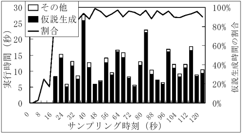 図7に各サンプリング時刻毎の実行時間(左軸で棒グラフ)と仮説生成の全実行時間に対する割合(右軸で折線グラフ)を示す(生成仮説上限数は3,000個)。棒グラフの黒い部分が仮説生成の時間であり、圧倒的に仮説生成に時間を要していることが分かる。実行時間を要しているサンプリング時刻24秒以降の仮説生成時間の割合の平均は、92%である。なお、「その他」の内で最も負荷の高い処理は、クラスタ統合である。クラスタ統合では、お互いのクラスタ内の仮説同士を組合せるので、組合せ数が多くなると処理時間がかかっている。