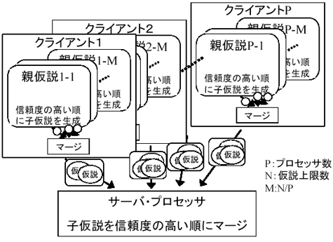 (b)各クライアントでは、サーバからの要求に基づき、分配された親仮説群を基に逐次版と全く同様に子仮説を信頼度の高い順に幾つか生成し、それらをサーバへ送信する。