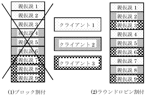 (a)N個の親仮説をクライアント台数Pで割り、各クライアントに分配する。