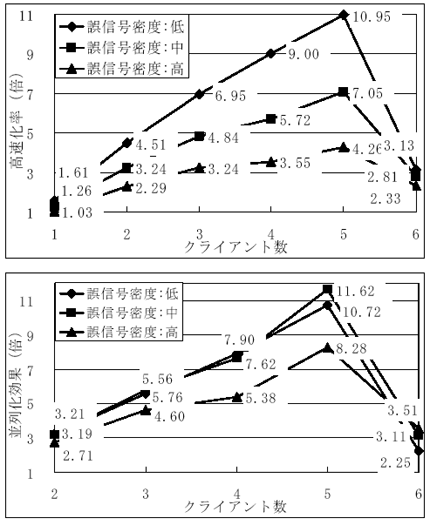 表2に、各クライアント数毎の1サンプリング時刻当たりの全実行時間及び仮説生成時間の平均を示す。クライアント数が0とは、従来の逐次の航跡型MHTプログラムでの実行時間であり、クライアント数が1とは、仮説の生成のみを別プロセッサで実行した場合の実行時間である。また、図10に、各クライアント数毎の高速化率(全実行時間の逐次プログラムとの比率)及び並列化効果(仮説生成時間の1クライアントとの比率)を示す。これらの結果から、以下のことが言える。