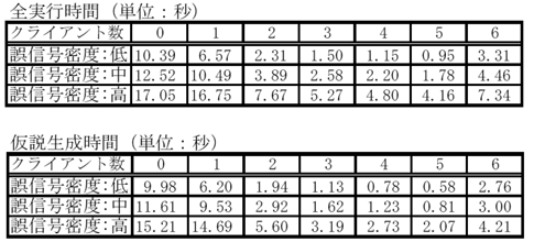 各クライアントで生成する子仮説の数を計測し、それが各クライアントでどの程度異っているかを調べた。その結果、各クライアントで生成する子仮説の数は、1クライアントの1並列実行当たりの平均で657個であった。これは、仮説上限数3,000個をクライアント数5で割った600に、先行して生成した数60を加えた数660に近い数字である。また、各クライアントの生成数の標準偏差(ばらつき)の平均は、55個であった。これは、657個に対して12%であり、静的負荷分散にもかかわらず、それほど負荷が不均衡になっていないと言える。