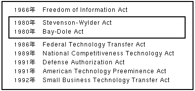 特に、1980年のStevenson-Wylder Actにより、大学や政府研究機関の民間への技術移転がミッションとなり、また、Bay-Dole Actにより、政府出資研究成果の知的所有権は、非営利の大学や政府研究機関に属することとなり、商業価値の高い研究を追及するインセンティブがあたえられた。さらに、大学側は、ライセンスやロイヤリティからの収入を教授陣と一部分け合うことができるようになり、実際の研究者に強いインセンティブがあたえられた。