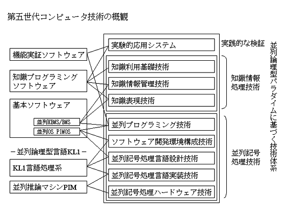 一番下にあるのが並列記号処理向 きのハードウェア技術。ICOTが目指したコン ピュータは、世の中で現在広く使われている大規 模科学技術計算というような方向ではなく、より 汎用的な事務処理一般を含めたものです。それ は、聞きなれない言葉かも知れませんが、学問的 には記号処理とひとまとめに呼ばれています。 ICOTが目指したのは、記号処理向きのハードウェア 技術といえます。それから、そのハードウェア の上にあるのが言語でして、このプログラミング 言語というのが、コンピュータシステムではいつ もおへそみたいなもので中核を占めています。 われわれの場合は、並列論理型という、並列処理の高 級言語を採用しました。その言語の実装技術、ま た、その言語をどのように設計するかという言語 仕様の作り方の技術、それからその言語を使う人 にどうやって心地よい開発環境を提供するかと いった言語関連のプログラミング環境を作る技 術、この三つの技術を開発しました。さらにその 技術および通常の並列処理の技術を用いて、問題を どのように定式化して並列処理のソフトを作って いくかというプログラミング技術、ここまでが主 要な技術としてリストアップされています。この 辺をひとまとめにして並列記号処理技術と分類で きます。第五世代の技術は並列推論というキー ワードで述べてきましたが一般的なコンピュータ サイエンスのエリアでは「並列記号処理技術」 と呼ばれるものです。
