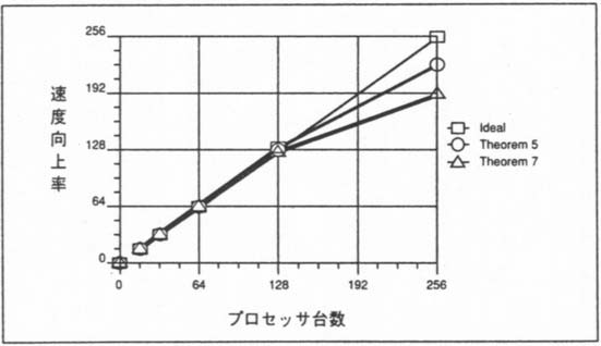次に定理証明問題の速度向上についてお話しし ます。定理証明という問題は、並列に処理できる 多くの部分に分けられますが、大規模科学技術計 算のような方程式がきちんとたっているわけでは ありません。したがって、動的に負荷の再配分を 繰り返す必要があります。それを徹底して行った ということで、最終的にこのような良好な成果が 得られたわけです。これは、256台のプロセッサを 使った例です。これですと、220倍ぐらいの速度向 上が得られているわけです。こういう結果に勇気 づけられて、並列のCADをやっている人や、法律 の推論システムをつくっている人が、いろいろな ノウハウをお互いに教え合い、プロセッサ台数に かなりよく比例した速度向上率が最近では得られ るようになっています。