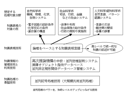 -- 成果の概要(1) -- 従来技術より数歩先んじた汎用並列処理の応用を開発 ⇒応用領域を、工学分野から、広く自然科学や、社会科学などの分野に 広げ、知識処理の本質的な問題へ踏み込む |