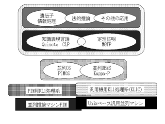 まず、一番下は、従来のPIM用のKL1処理系これ は、汎用機用のKL1処理系KLICに合うようにどん どん拡張したり、改良したりしていく考えです。