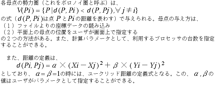 本プログラムは、平面上に与えられた母点のデータより、各母点の勢力圏を表