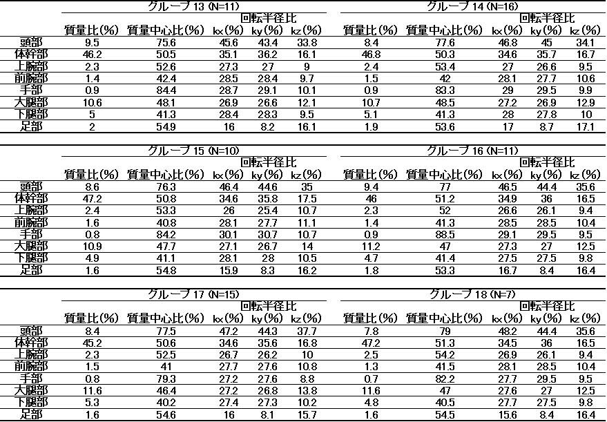 それぞれの群における,各体節の質量比と質量中心比と回転半径比の平均を表に示す.